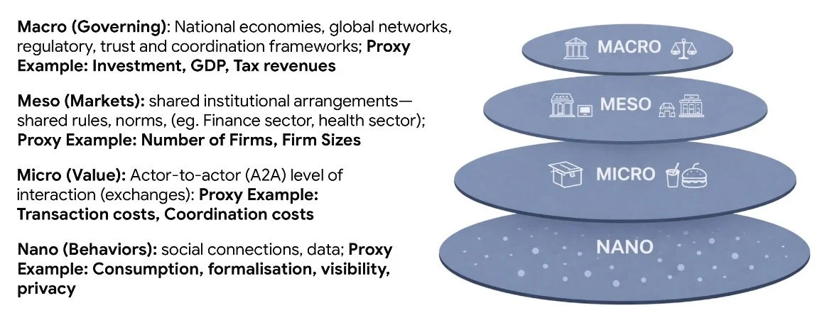 The reality today is far more entangled. What happens at the level of individual behaviour (nano) reshapes value creation (micro), which in turn restructures markets (meso), and ultimately pressures the very foundations of governance (macro). Each layer has its own logic, yet deeply coupled to the others.